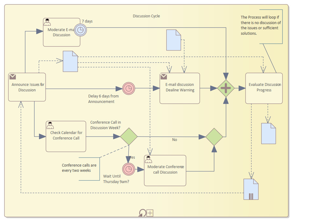 Issue: Sub-process ‘Discussion Cycle’ has loopCharacteristics: Standard but no loop condition or multi-instance detail. If intended to repeat, provide loop condition or convert to multi-instance with clear semantics.