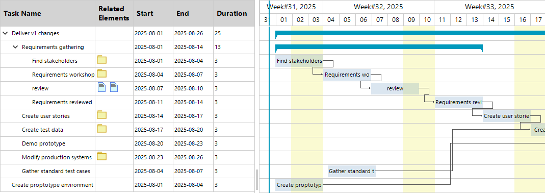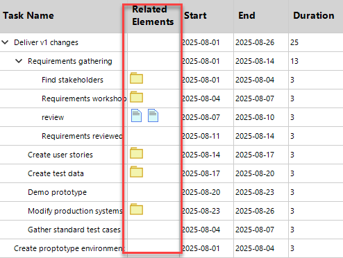 The Related Elements column shows everything connected to a task at a glance. Each item shows as a compact icon (e.g., Requirement, Risk, Issue, Test), with a tooltip naming the element and its status. Clicking an icon opens the target in EA (or the detail pane), so you can jump straight from plan to model. If multiple links exist, icons stack with small count badges. This keeps the grid clean while making traceability obvious: you can see which tasks deliver requirements, mitigate risks, or verify via tests—without leaving the Gantt.
