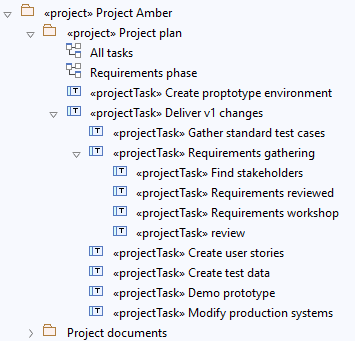 In EA’s Project Browser the plan appears as a tidy tree: a “Project Plan” package (or similar) with parent tasks as top-level nodes and child tasks indented beneath them. The hierarchy mirrors the Gantt’s left pane, so expanding a parent shows its work breakdown at a glance. If you prefix names with Work Breakdown Structure codes (e.g., 1.2.3 Build UI