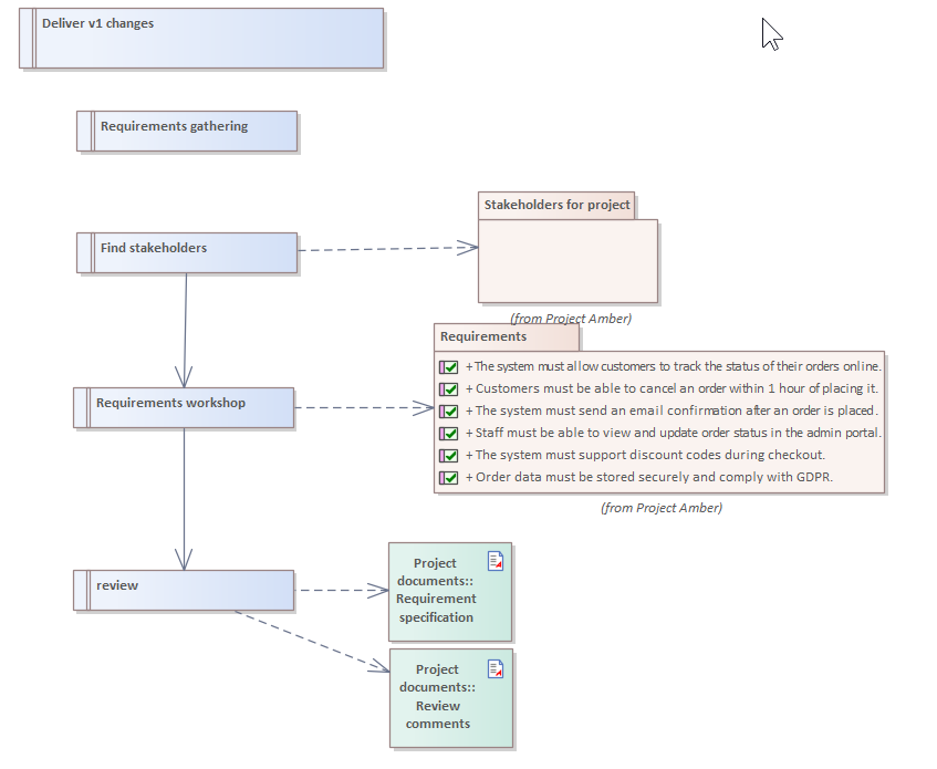 Now you can create project plans in EA, and link those plans to everything else that you already have in your repository. You can now link tasks together, and visualize them on a Gantt Chart, AND manage the dates of those tasks in an intuitive way.